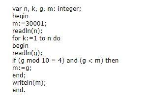 Напишите программу, которая в последовательности натуральных чисел определяет минимальное число, оканчивающееся на 4. Программа получает на вход количество чисел в последовательности, а затем сами числа. В последовательности всегда имеется число, оканчивающееся на 4. Количество чисел не превышает 1000. Введённые числа не превышают 30 000. Программа должна вывести одно число — минимальное число, оканчивающееся на 4.