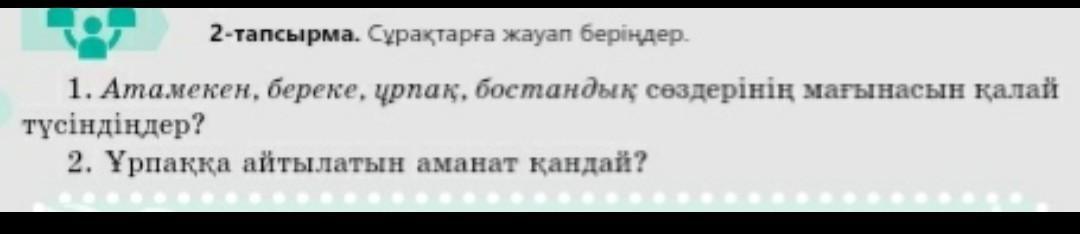 2. Үлкендерден жиі еститінім еліне, халқына басшы бол. Қараңғыда жетелейтін жан бол. Елінннің мақтанышы бол, мына ата-бабадан қалған жерге иелік етіп, жаныммен сақта. Не болсада адам бол. Сондықтан ұрпаққа айтылатын аманат осы деп білемін.