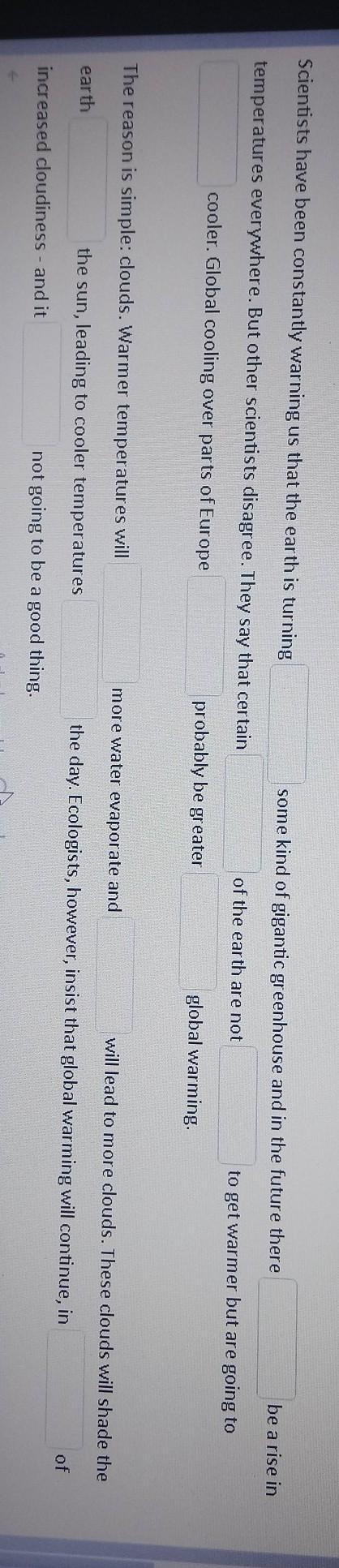 Scientists have been constantly warning us that the earth is turning into some kind of gigantic greenhouse and in the future there will be a rise in temperatures everywhere. But other scientists disagree. They say that certain areas/regions of the earth are not going/likely to get warmer but are going to get/become cooler. Global cooling over parts of Europe will probably be greater than global warming.