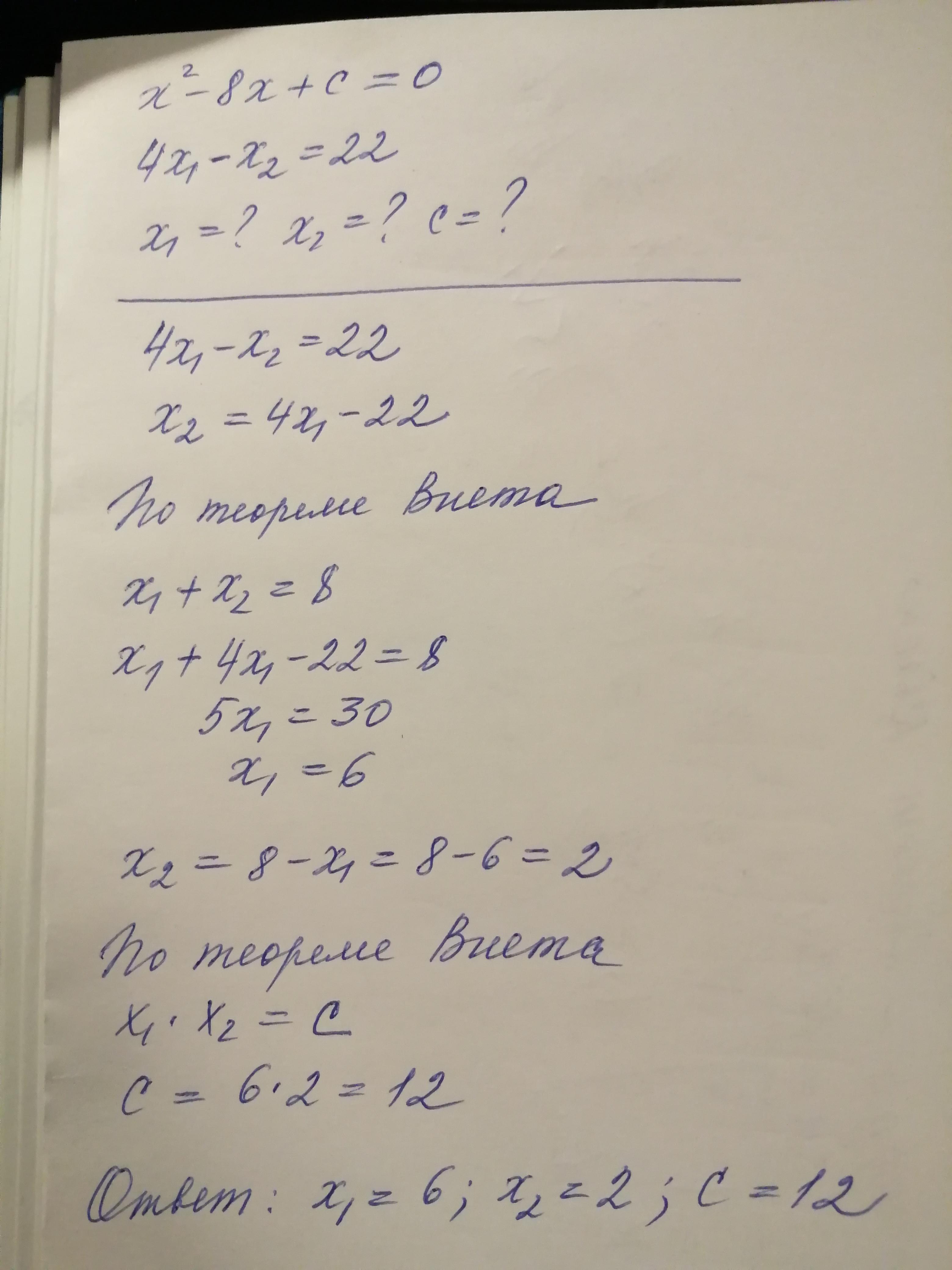 Корни х1 и х2 уравнения х2 -8х+ с =0 удовлетворяют условию 4х1 - х2 = 22 . Найдите корни уравнения и значение с.