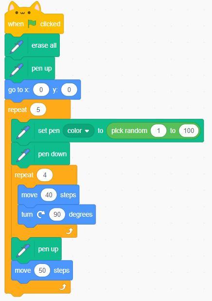 У Скретчі!!! Допоможіть!!! Віддаю свої останні бали!!! Складіть проект для малювання п‘яти квадратів зі сторонами 40 кроків різного кольору, які розміщені один від одного на відстані 10 кроків