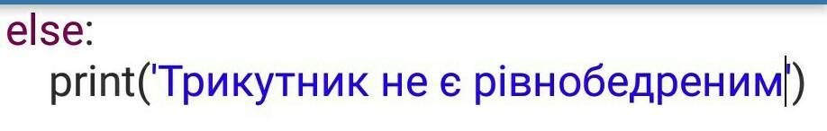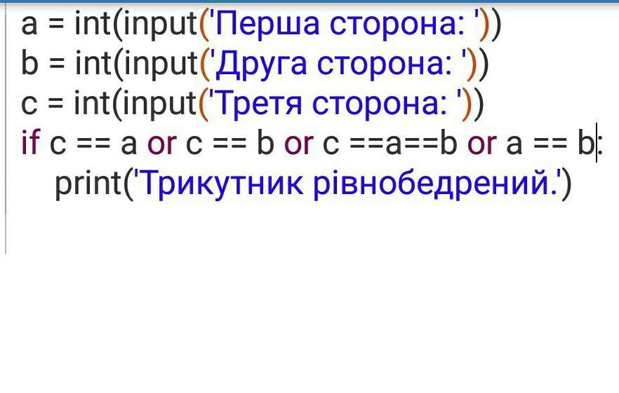 Дано три сторони трикутника. Розробіть програму для визначення, чи є цей трикутник рівнобедреним. В программе Python
