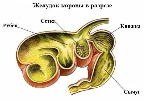 Желудок коровы, как и многих травоядных животных имеет несколько камер. Каждая из камер, имеющая свое