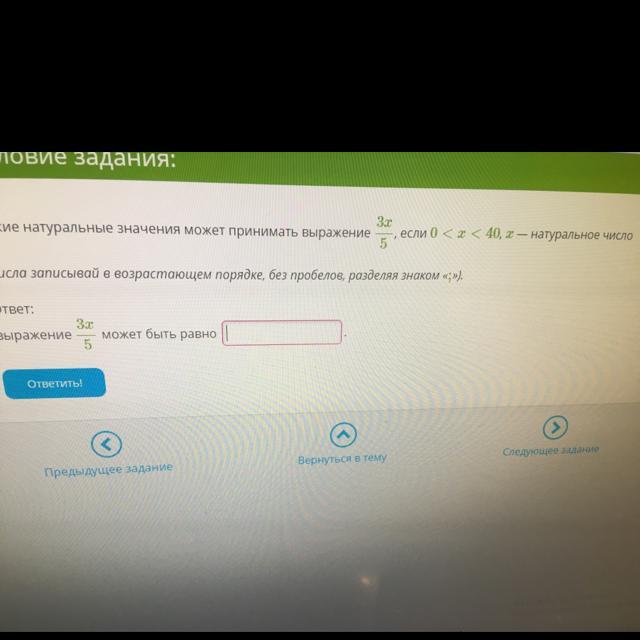 3; 6; 9; 12; 15; 18; 21. смысл в том, что в это выражение вместо x нужно подставлять числа 5, 10, 15, 20, 25, 30, 35, тк только в таком случае выражение 3х/5 будет принимать натуральное значение, а эти числа как раз попадают в промежуток (0;40)