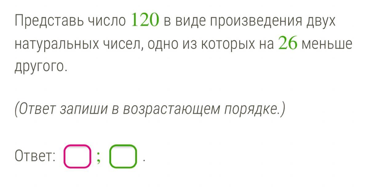 Представь число 120 в виде произведения двух натуральных чисел, одно из которых на 26 меньше другого.