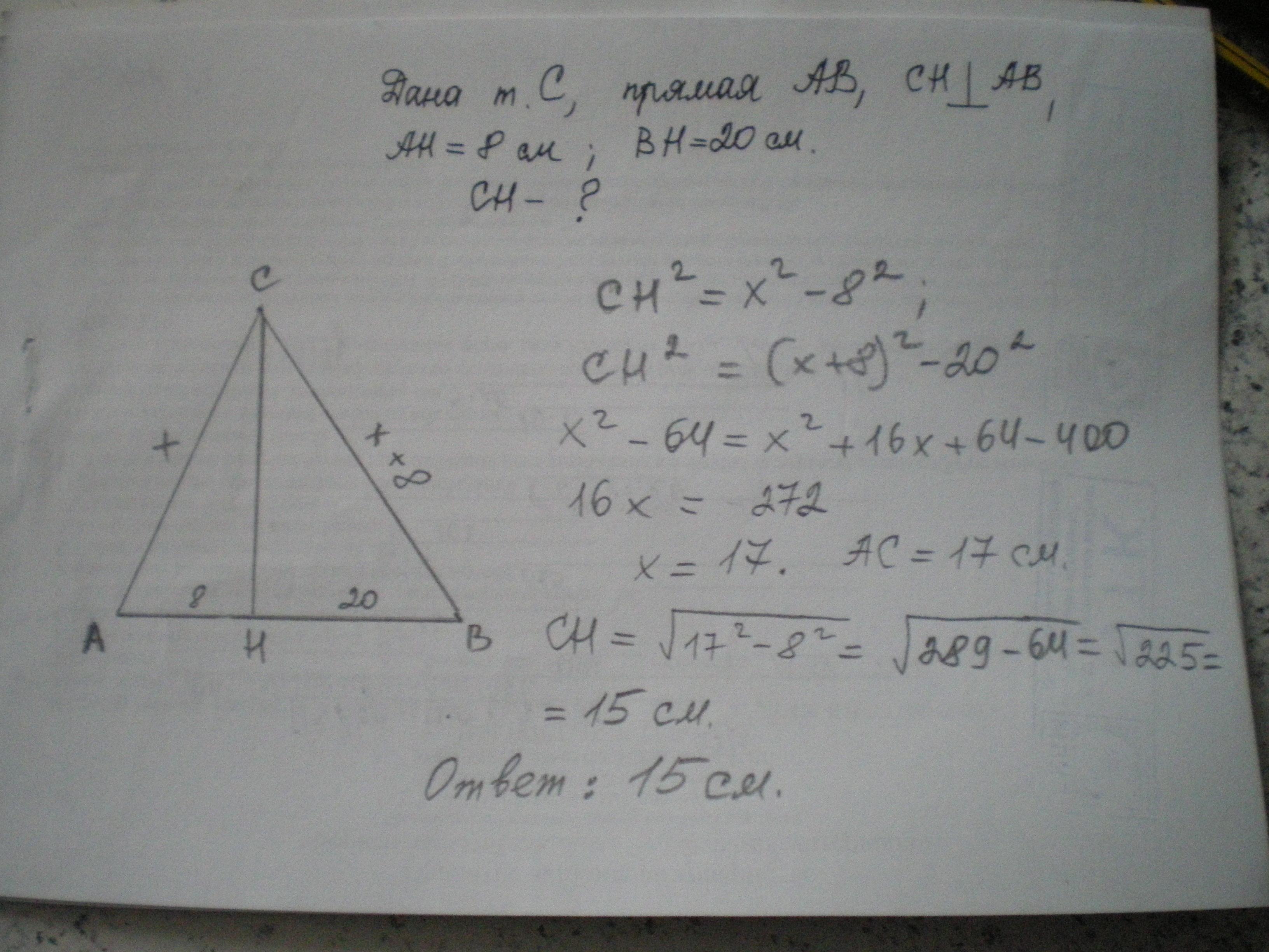 Из одной точки до прямой проведено перпендикуляр и две наклонной,разница длинны каких составляет 8см.Найдите длинну перпендикуляра,если проекции наклонных равняются 8см и 20 см.(Обьясните как вы зделали эту задачу,мне нужно!!)