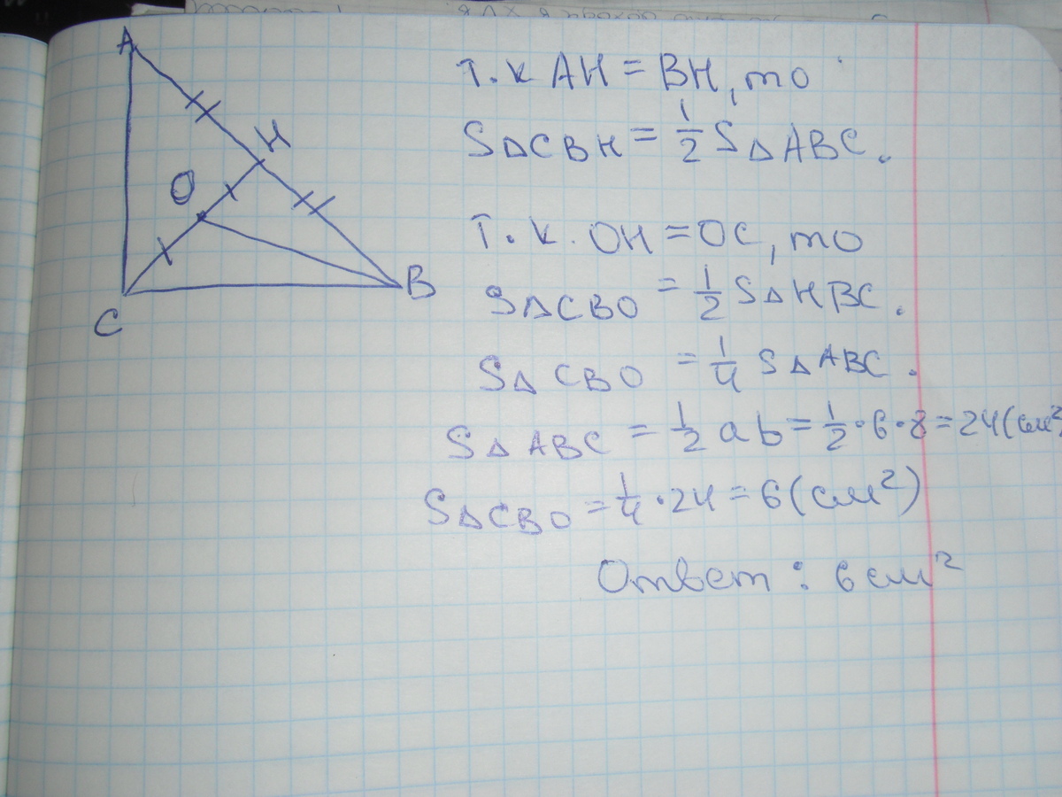 В прямоугольном треугольнике АВС точка О-середина медианы СН проведённой к гипотенузе АВ.АС=6 см.ВС=8 СМ.НАЙДИТЕ ПЛОЩАДЬ ТРЕУГОЛЬНИКА ОВС.