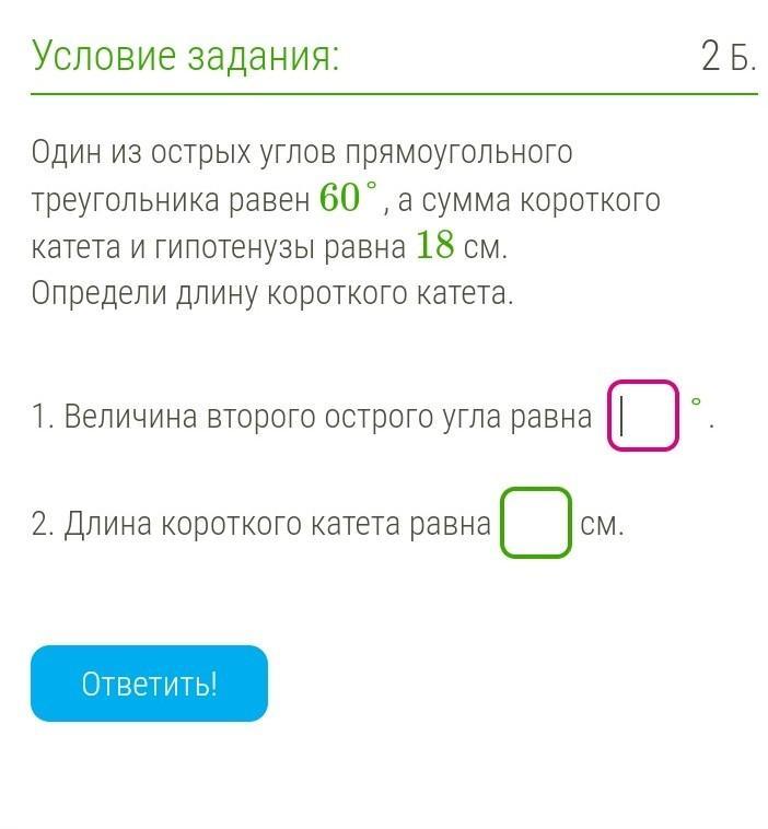 2)катет напротив угла в 30° равен половине гипотенузы. пусть х - гипотенуза, тогда катет равен 0,5х. имеем уравнение: х+0,5х=18; 1,5х=18, х=18:1,5; х=12(см) - гипотенуза. тогда короткий катет равен 18-12=6см
