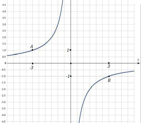 Определим координаты какой-либо точки, принадлежащей графику. Например, точка А(-3,1) , точка В(3,-1) . Подставим координаты, например, точки А в уравнение гиперболы, получим