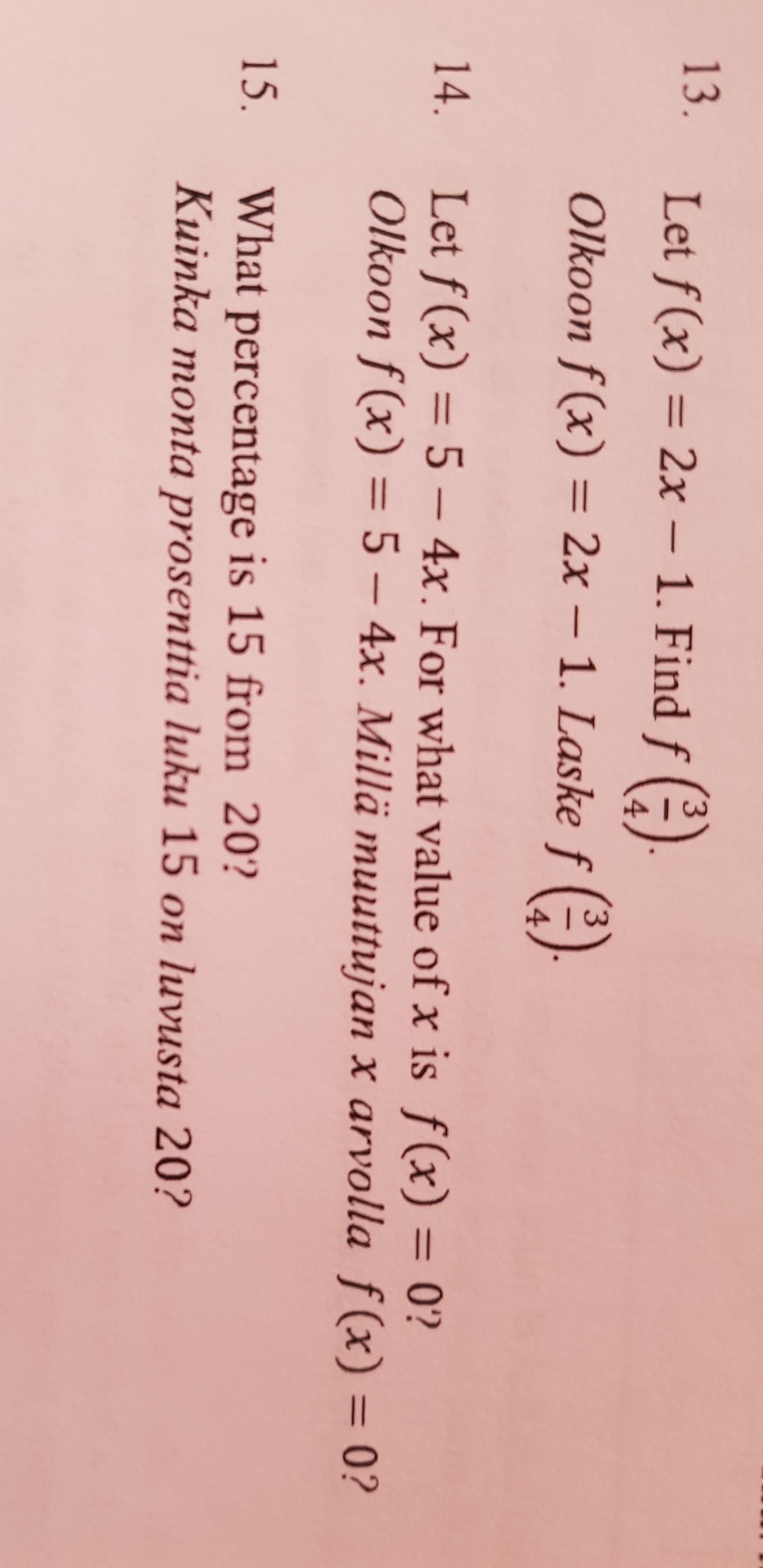 13); ; f(x)=2x-1; ; ,; ; f(frac{3}{4})=2cdot frac{3}{4}-1=frac{3}{2}-1=frac{1}{2}=0,5 \\\14); ; f(x)=5-4x; ; ,; ; 5-4x=0; ; to ; ; 4x=5; ; ,; ; x=1,25; ; to ; ; f(1,25)=0\\\15); ; 20; ; -; ; 100%\.quad ; ; 15; ; -; ; x%qquad qquad x=frac{15cdot 100}{20}=75%
