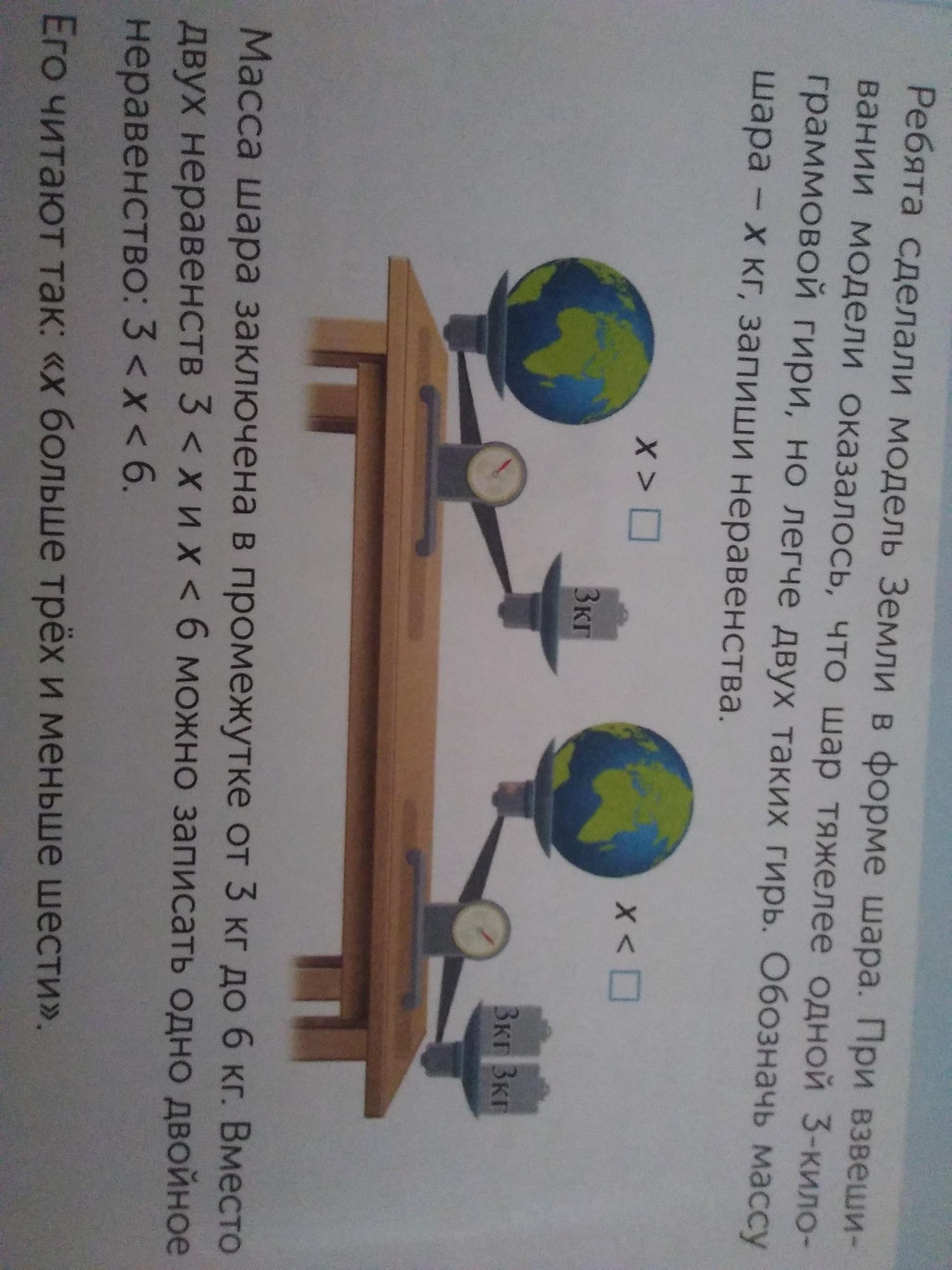 Даю 100 баллов! ребята сделали модели земли в форме шара. при взвешивание модели оказалось, что шар тяжелее одной 3-килограммовой гири, но легче двух таких гирь. обозначь массу шара - x кг, запиши неравенства.