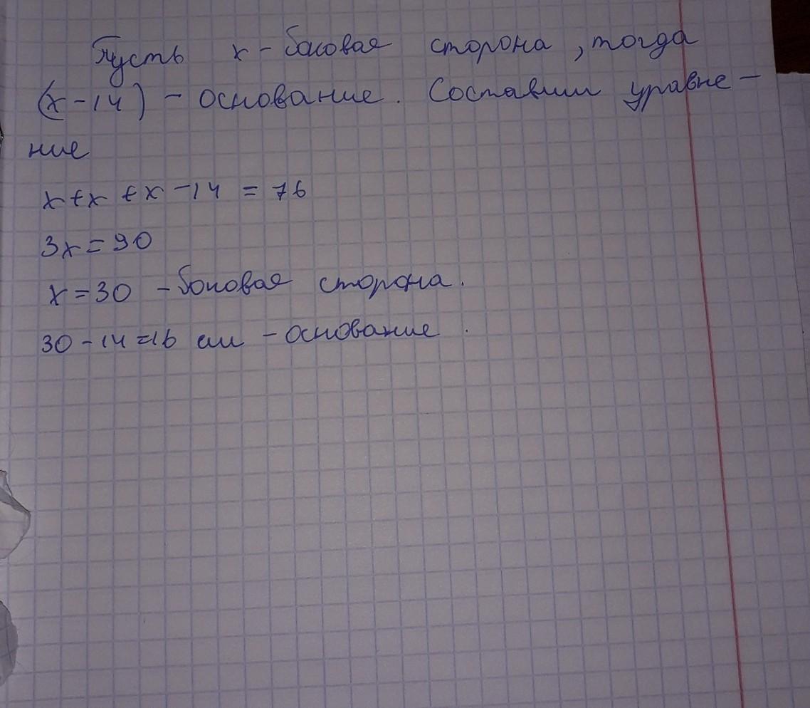 Пусть x (см) равна боковая сторона, тогда основание будет равно (x-14) (см). Т.к. боковые стороны равнобедренного тр-ка равны, то вторая боковая сторона тоже x (см). Периметр тр-ка равен 76 (см).