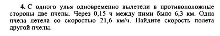 Пусть скорость одной из пчел - х, тогда их совместная скорость - х+21,6 км/ч, что по условию равно S/t, т.е. 6,3/0,15. Составим уравнение и решим его: