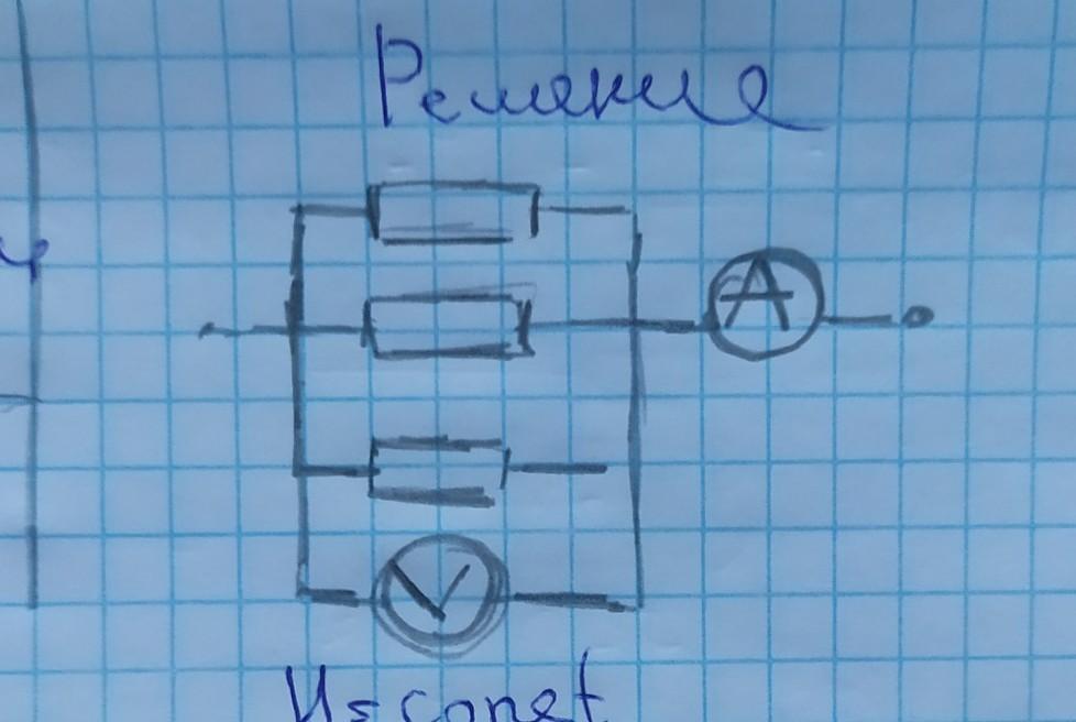 на рисунке изображена схема участка электрической цепи. Каждый резистор имеет сопротивление 10 Ом , вольтметр показывает напряжение 3В . Амперметр показывает т