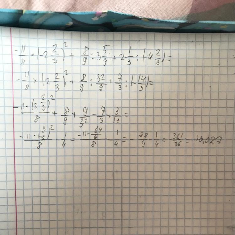 Найдите значение выражения: -1 1/8*(-2 2/3)^2+8/9:3 5/9+2 1/3:(-4 2/3) Ответ представьте в виде десятичной дроби.