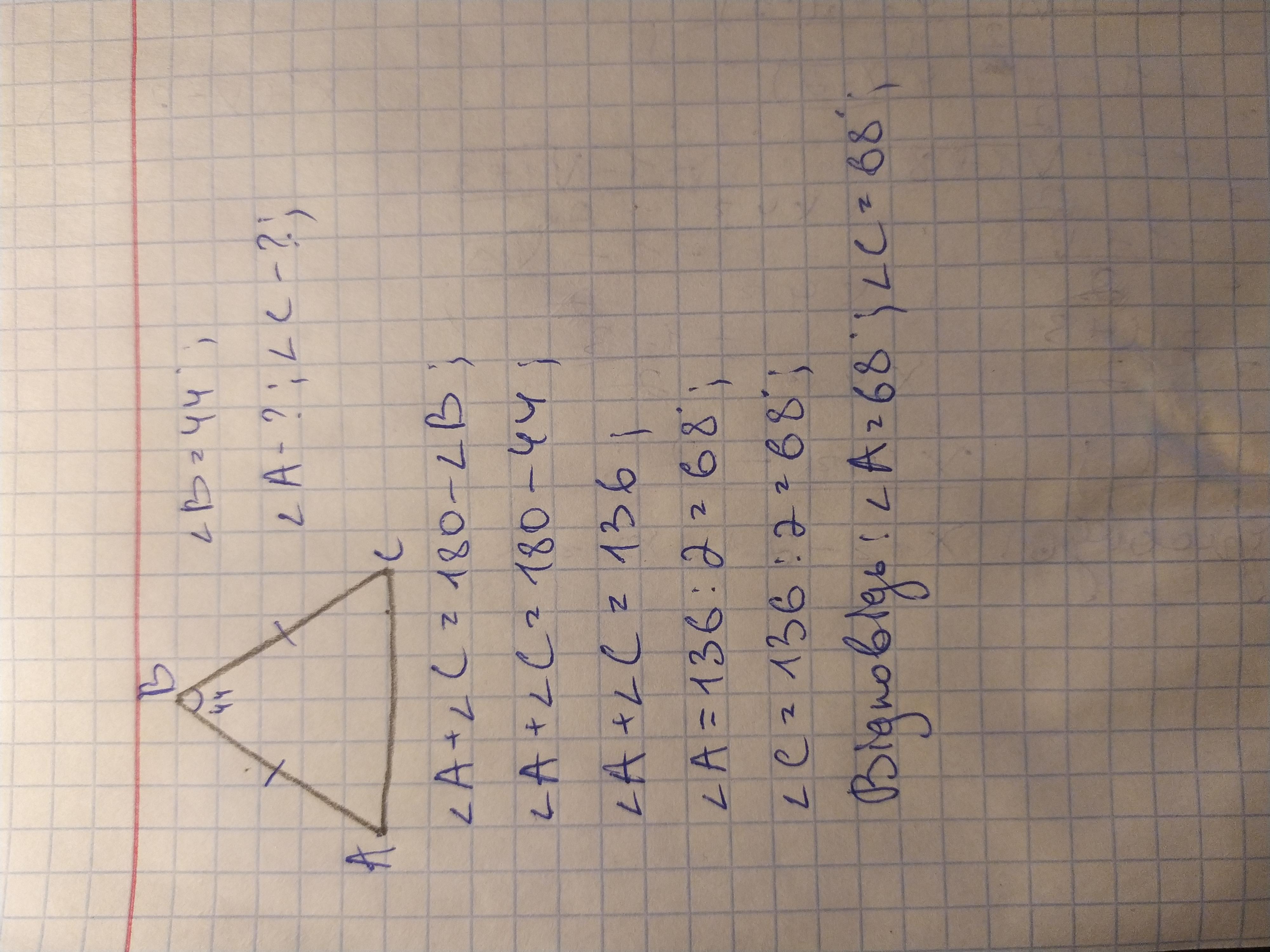 Кут при вершинi рiвнобедреного трикутника дорiвнює 44°. Знайти кути при основi цього трикутника.