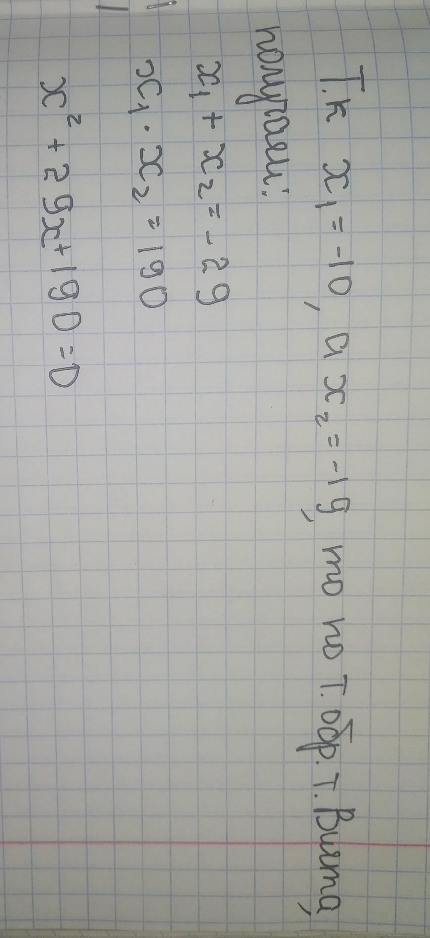 Составить квадратное уравнение, корнями которого являются числа x1=-10; x2=-19, при этом коэффициент а=1
