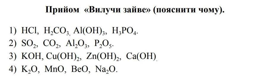 - AI2O3 — зайве, тому що це амфотерний оксид, а всі інші формули просто оксиди;