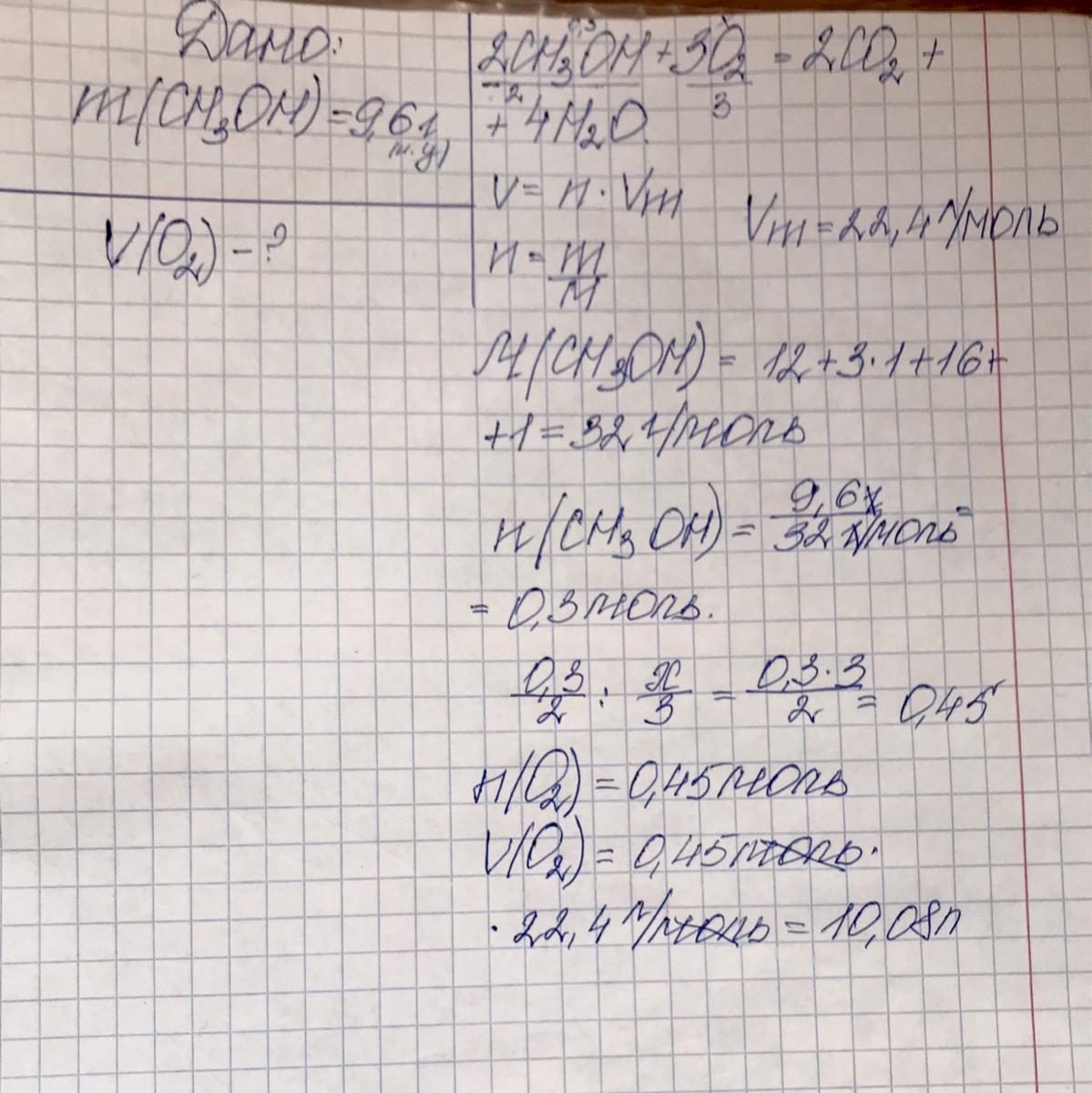 Який об‘єм кисню витрачається на спалювання метанолу масою 9,6г (н.у.)