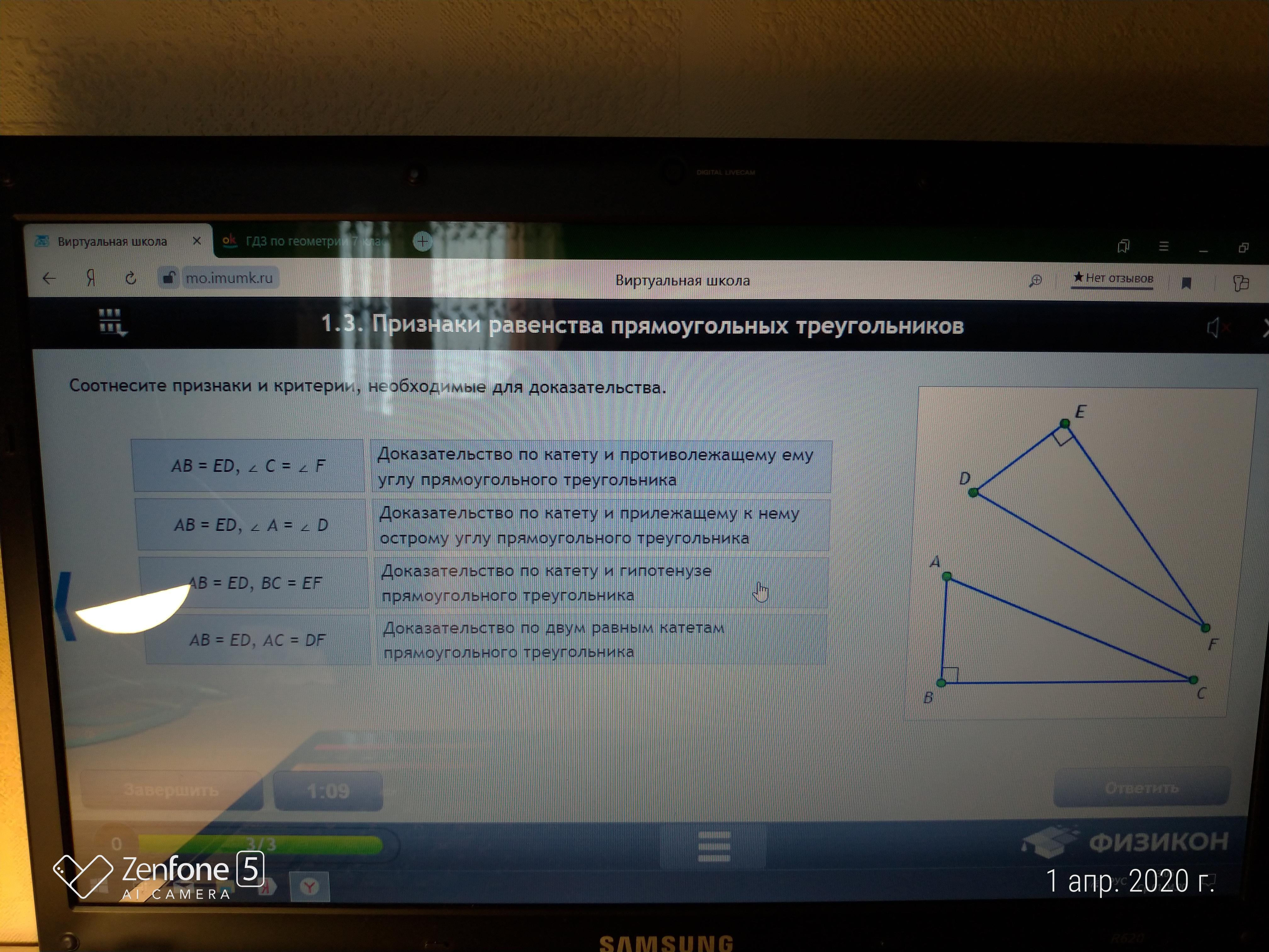 1) AB=ED, C=F по катету и противолежащему острому углу