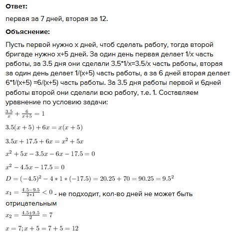 Пусть первой нужно х дней, чтоб сделать работу, тогда второй бригаде нужно х+5 дней. За один день первая делает 1/x часть работы, за 3.5 дня они сделали 3.5*1/x=3.5/x часть работы, вторая за один день делает 1/(x+5) часть работы, а за 6 дней вторая делает 6*1/(x+5) =6/(x+5) часть работы. За 3.5 дня работы первой и 6дней работы второй они сделали всю работу, т.е. 1. Составляем уравнение по условию задачи: