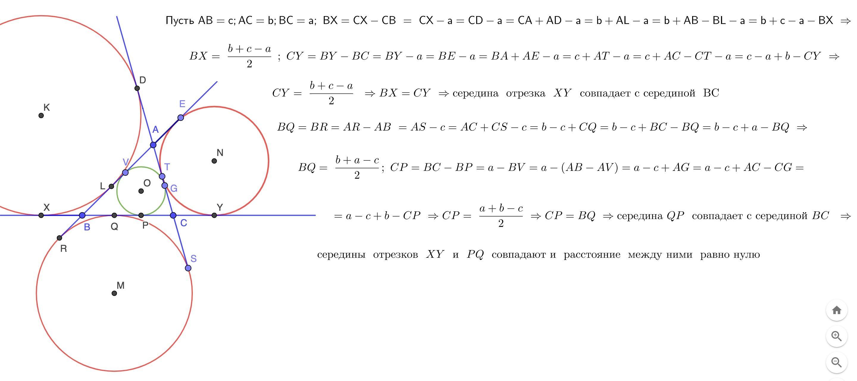 Вписанная и вневписанная окружность треугольника ABC касаются стороны BC в точках P и Q. Вневписанные окружности треугольника ABC касаются продолжений стороны BC за точки B и C в точках X и Y. Найдите расстояние между серединами отрезков PQ и XY, если BC=24.