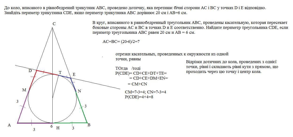 До коло, вписаного в рівнобедрений трикутник ABC, проведено дотичну, яка перетинає бічні сторони AC і BC у точках D і E відповідно. Знайдіть периметр трикутника CDE, якщо периметр трикутника ABC дорівнює 20 см і AB=6 см.