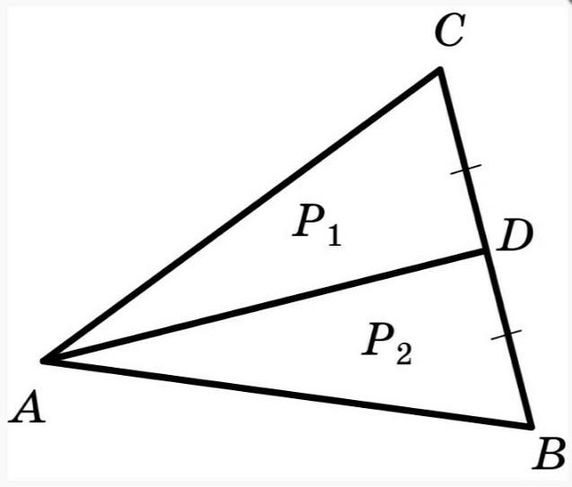 В равнобедренном треугольнике AB = 8 см и медиана AD. Периметр P 1 меньше P 2 на 2 см.