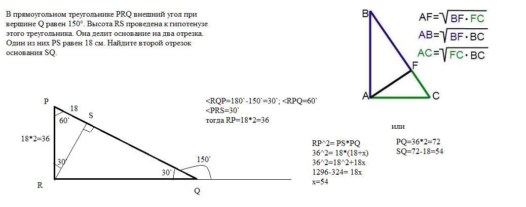 вершине Q равен 150°. Высота RЅ проведена к гипотенузе