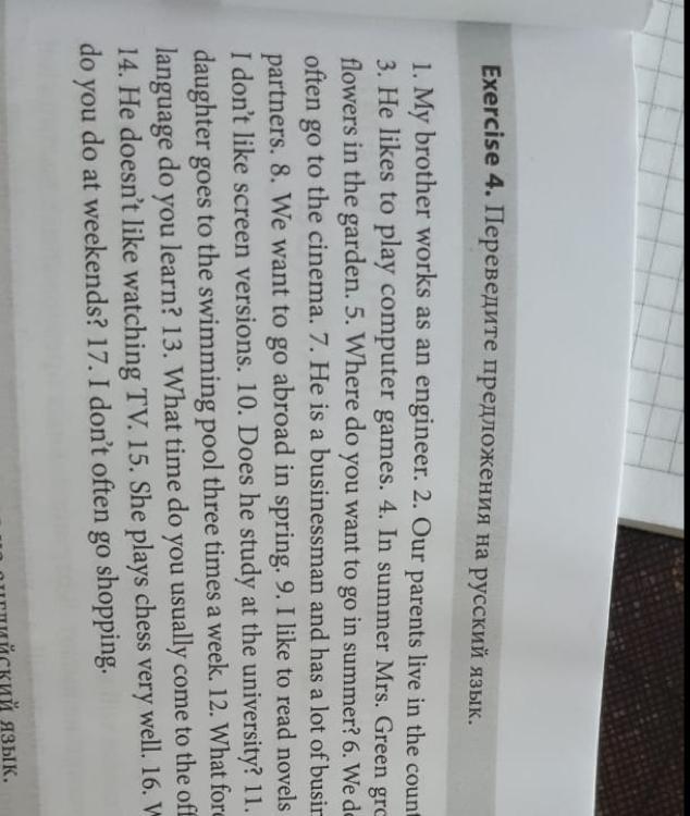 1. Мой брат работает инженером. 2. Наши родители живут на счету 3. Он любит играть в компьютерные игры. 4. Летом миссис Грин цветет в саду. 5. Куда вы хотите поехать летом? 6. Мы часто ходим в кино. 7. Он бизнесмен и имеет много деловых партнеров. 8. Мы хотим поехать за границу весной. 9. Я люблю читать романы, мне не нравятся экранизации. 10. Он учится в университете? 11. Дочка ходит в бассейн три раза в неделю. 12. Какой язык вы изучаете? 13. В какое время ты обычно приходишь на 14. Ему не нравится смотреть телевизор. 15. Она очень хорошо играет в шахматы. 16. Что делать на выходных? 17. Я не часто хожу по магазинам. вы