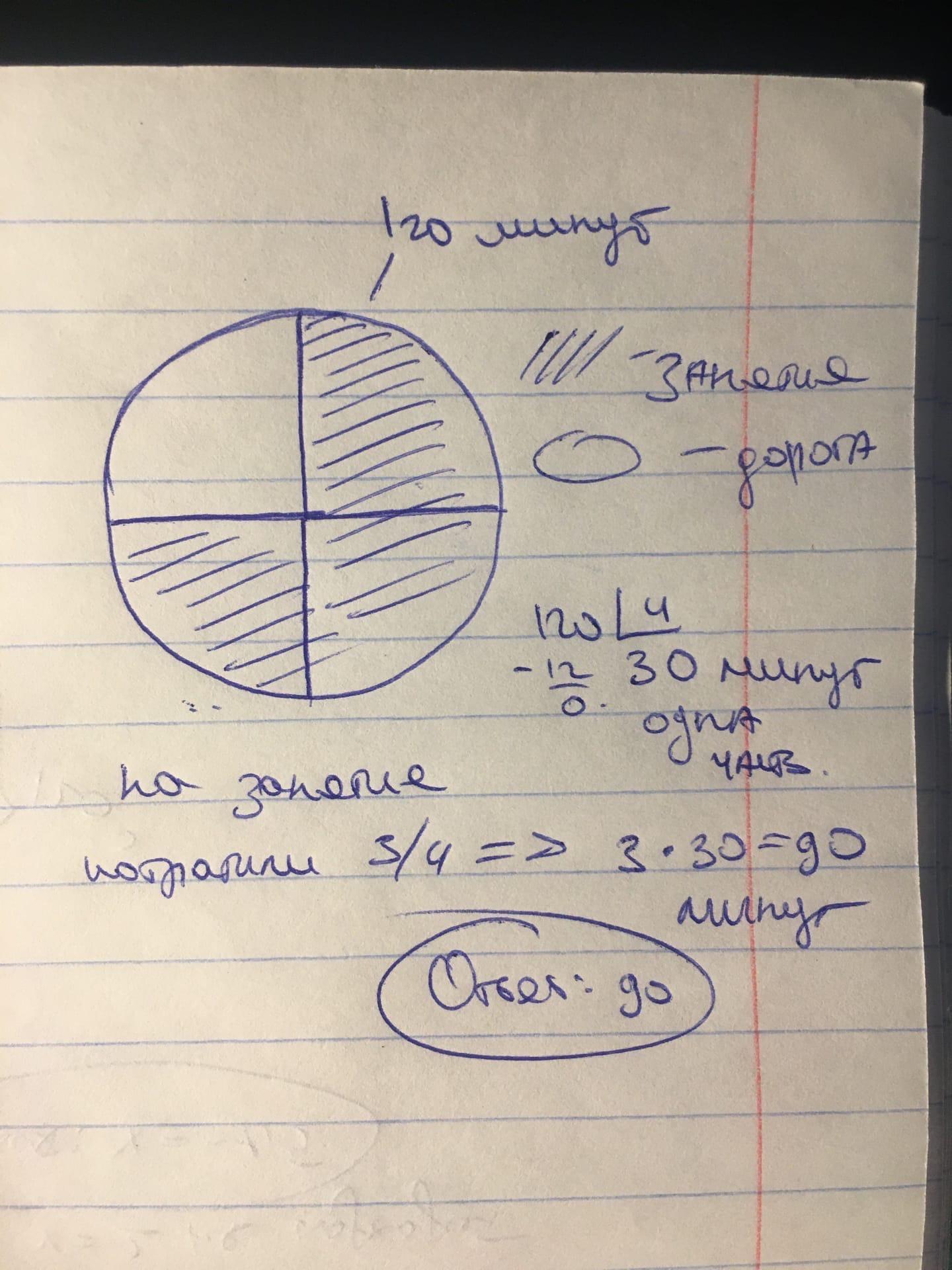 для участия в музыкальном кружке нафиса тратил 120 минут в день3/4 части этого времини она тратит на заняятие по музике а1/4 часть тратит на доро сколько времине нафиса занимается в кружке составьте задачу по рисунку и решите ее гу