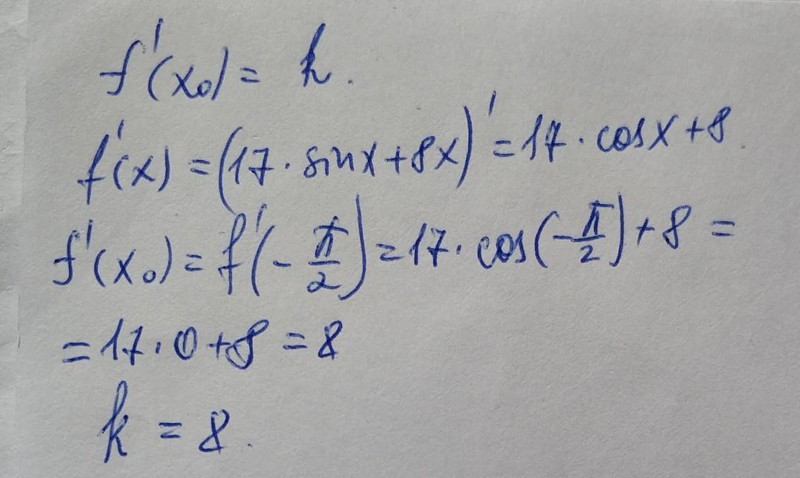 Вычисли угловой коэффициент касательной к графику функции f(x)=17sinx+8x в точке с абсциссой x0=−π/2