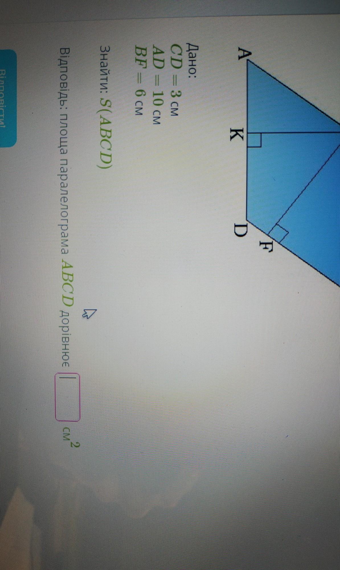 Высота параллелограмма проведена из вершины тупого угла и равняется 5 см. Высота делит сторону параллелограмма пополам. Острый угол равняется 30 градусам.