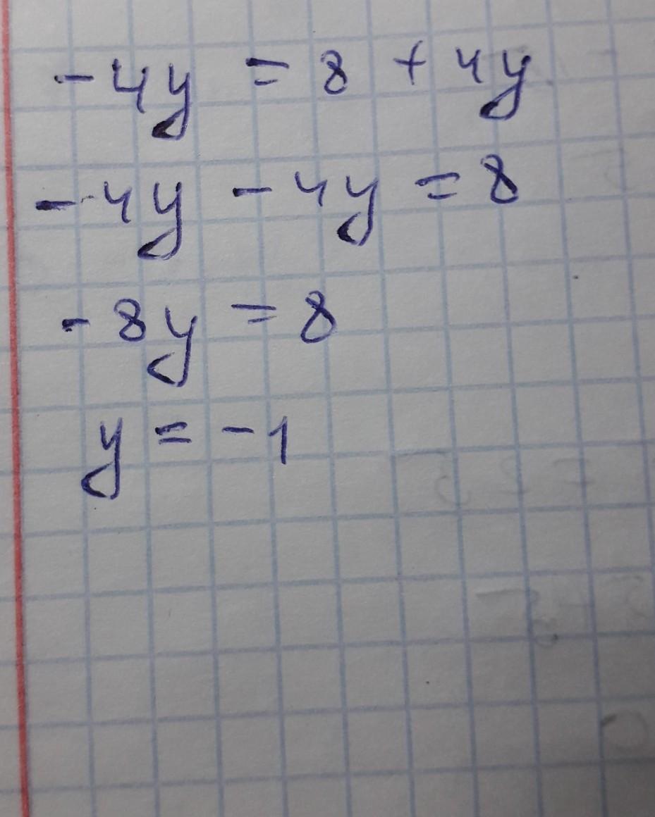 Ответ:-4y=8+4y -4y-4y=8 -8y=8 y=8:(-8) y=-1 В. -1