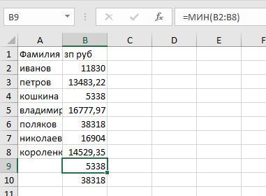 В программе MS Excel использована функция MIN. И записана следующим образом: =MIN(B2:B8)