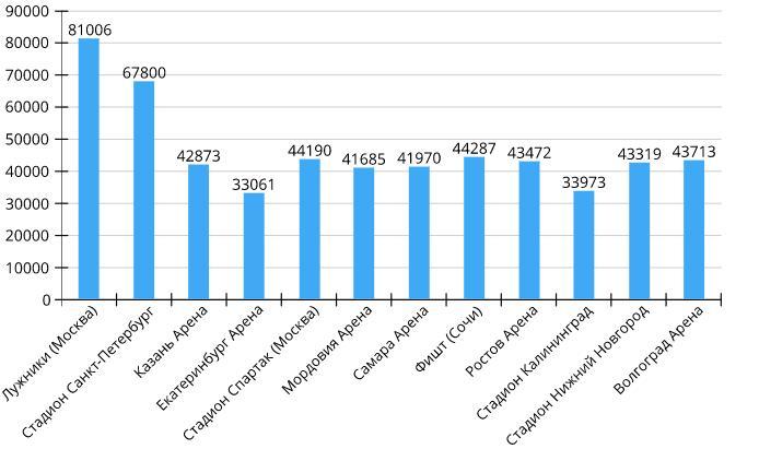 На диаграмме представлена вместимость стадионов, выбранных для проведения чемпионата мира по футболу в 2018 году.