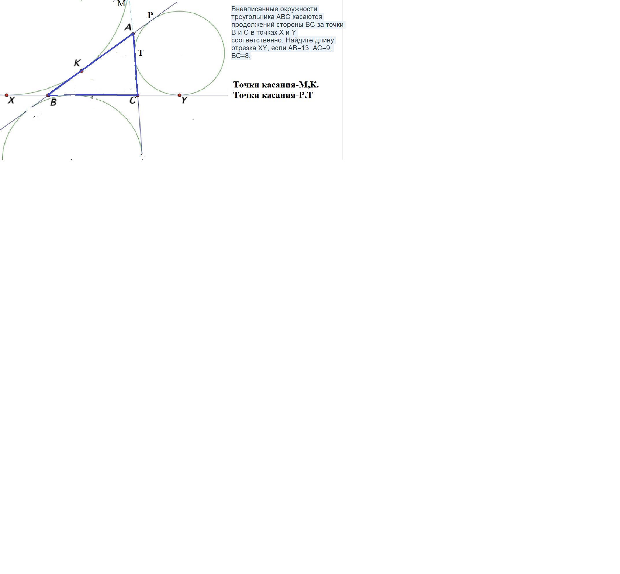 Вневписанные окружности треугольника ABC касаются продолжений стороны BC за точки B и C в точках X и Y соответственно. Найдите длину отрезка XY, если AB=13, AC=9, BC=8.