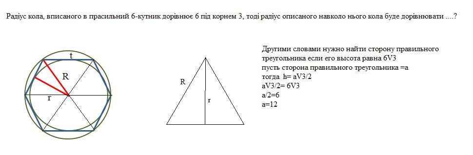 Радіус кола, вписаного в прасильний 6-кутник дорівнює 6 під корнем 3, тоді радіус описаного навколо нього кола буде дорівнювати ....? СРОЧНО плиз !!!!