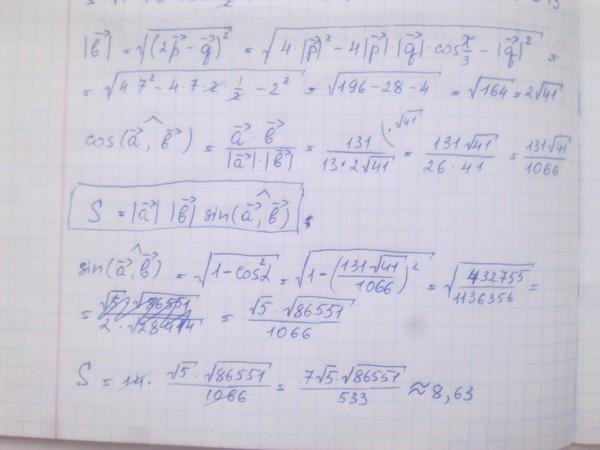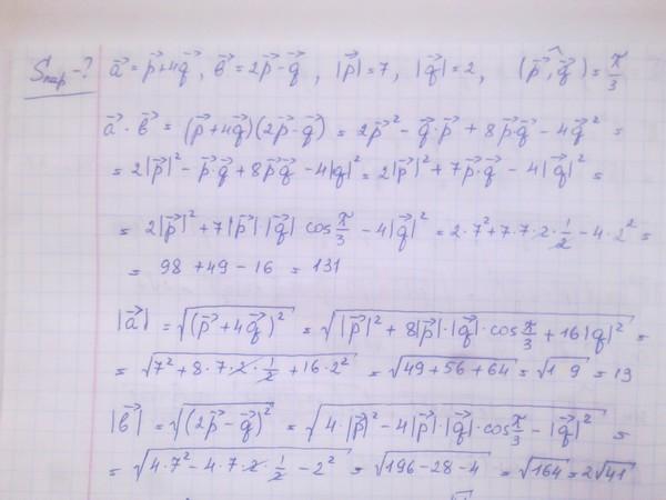 Задача 22. Вычислите площадь параллелограмма, построенного на векторах и b, если = p + 4ã, b = 2p - q, |p| = 7 |q|= 2, угол между векторами p и q равен 30°.
