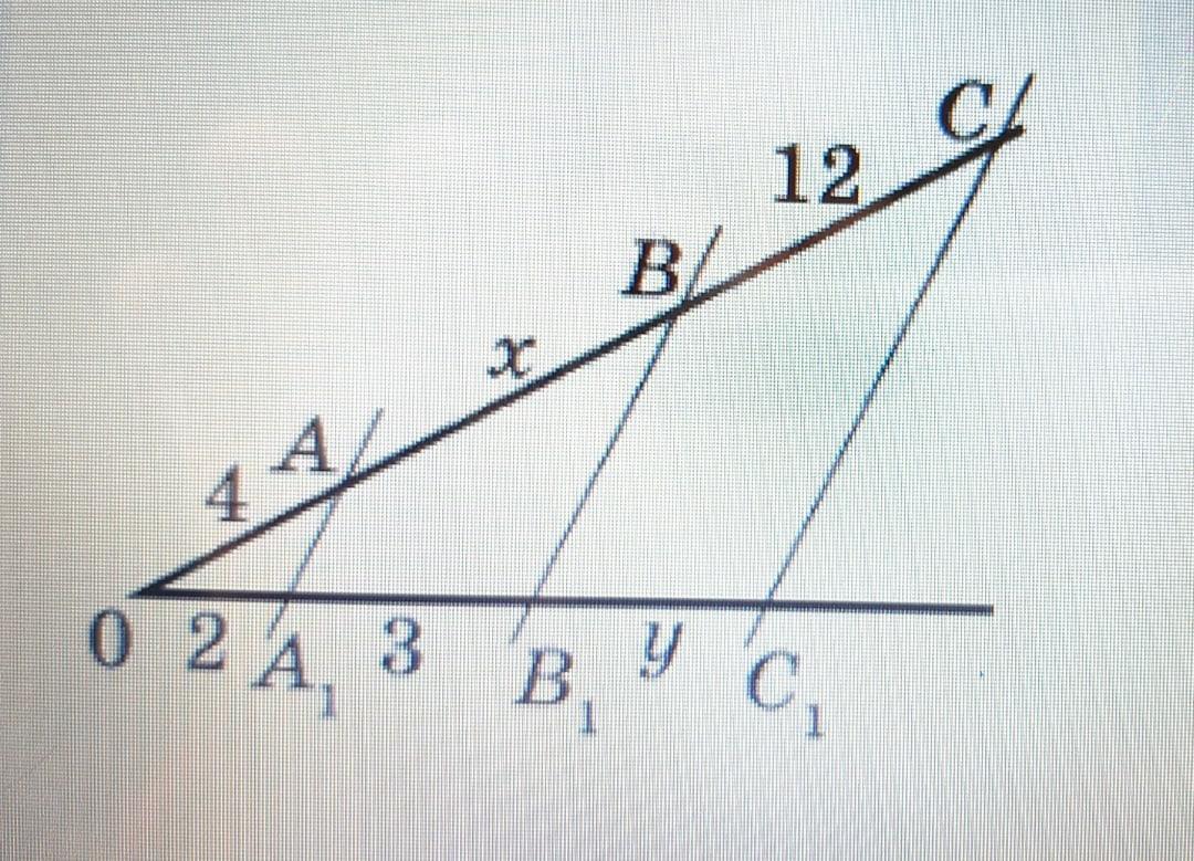 Объяснение: Треугольники ОАА ₁ОВВ₁₁ , ОСС₁₁подобны по двум углам? ∠О-общий, ∠ОА₁А= ∠ОВ₁В= ∠ОС₁С как соответственные углы при параллельных АА1 || ВВ1 || СС1 и секущей ОС. 1) Тогда соответственные стороны этих треугольников пропорциональны ОА/ОА₁= ОВ/ОВ₁=ОС/ОС₁ ⇒ 4/2 =(4+х)/(2+3) ⇒ (4+х)/5=2 ⇒ 4+х=10 ⇒х=6. 2) Тогда сторона ОС= 4+6+12=22, ОС₁- 2+3+у= 5+у 4) ОС/ОС₁= ОА/ОА₁ ⇒ 22/(5+у)=2 ⇒ 5+у=11, ⇒у=6