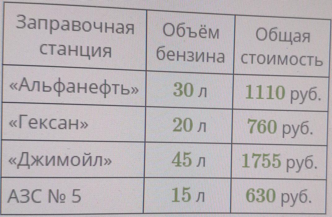 Максим выбрал заправку,где бензин самый дешёвый. Сколько рублей стоит на этой заправке 53л бензина?