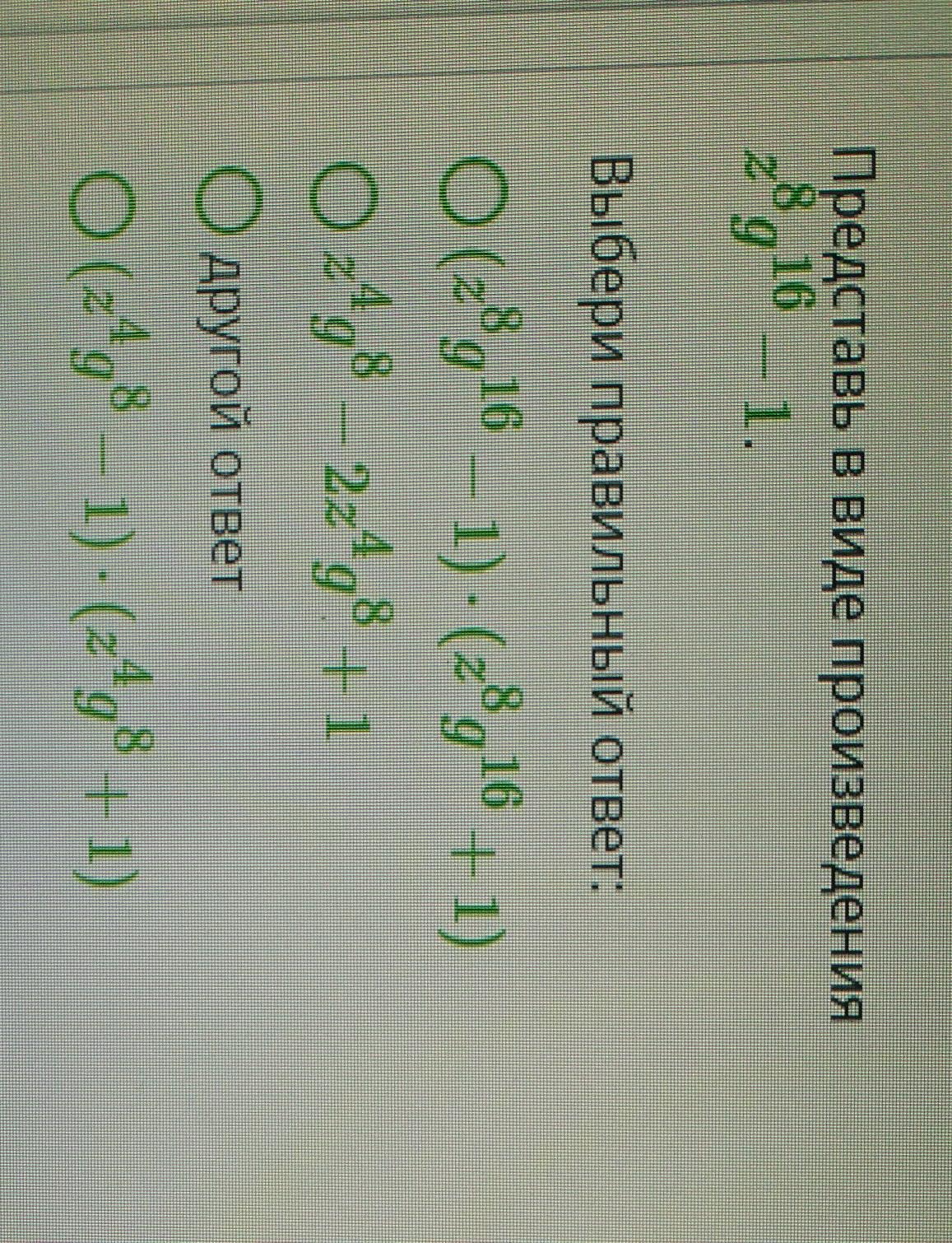 Правильный ответ - четвёртый,содержащийся в условии, подчёркнут сверху одной чертой . Если далее раскладывать на множители получившееся выражение по формуле разности квадратов, то можно прийти к другому ответу, подчёркнутому двумя чертами. И это разложение будет полным .