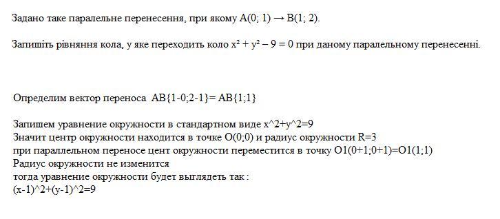 Запишіть рівняння кола, у яке переходить коло x² + y² – 9 = 0 при даному паралельному перенесенні.