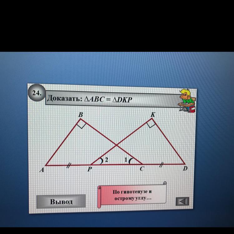 2)ΔАВС=ΔDКР как прямоугольные по гипотенузе и острому углу :