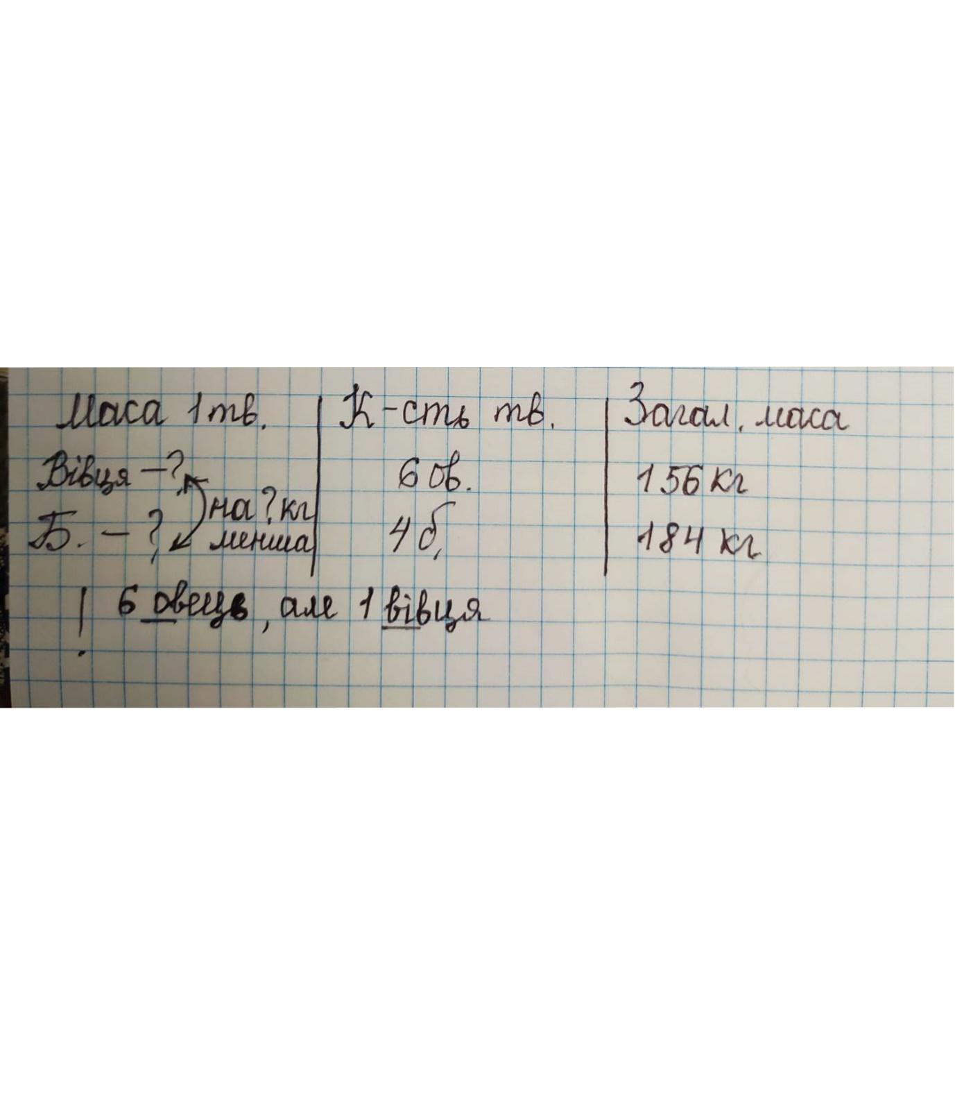 маса 6 овець дорівнює 156 кг ба 4баранів - 184 кг. а скільки кілограмів одна вівця легше від одного барана? фото це умова!