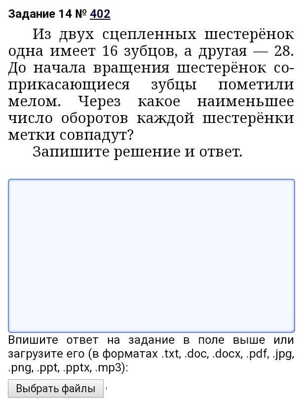 Таким образом, наименьшее общее кратное — 112. Следовательно первая шестерёнка — 112 : 16 = 7 оборотов, вторая шестерёнка — 112 : 28 = 4 оборота.