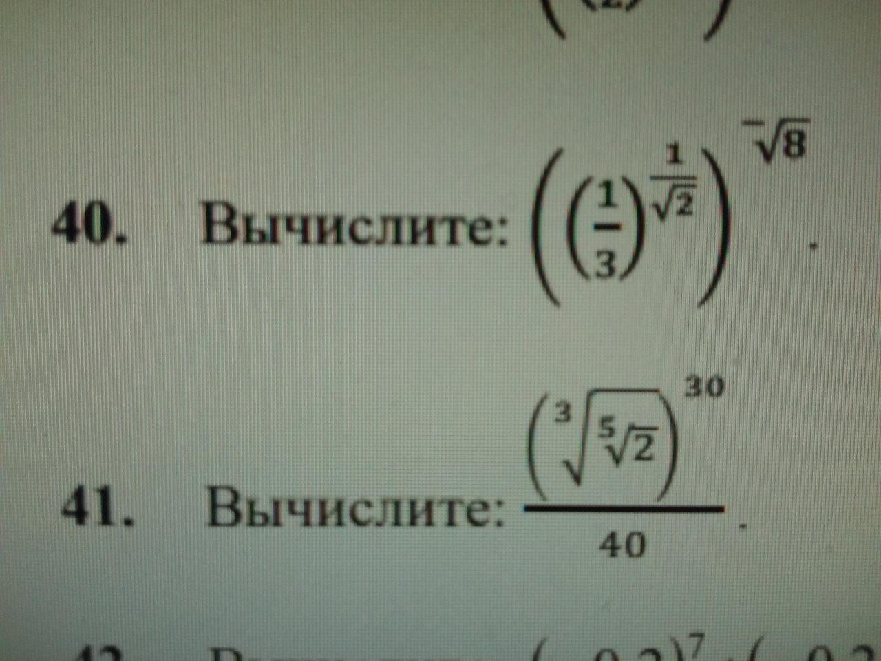 frac{:left(sqrt[3]{sqrt[5]{2}}right)^{30}}{:40} =\left | ::left(sqrt[3]{sqrt[5]{2}}right)^{30} = left(left(sqrt[5]{2}right)^{frac{1}{3}}right)^{30} = left(sqrt[5]{2}right)^{10}=(2^{frac{1}{5}})^{10}=2^2=4 right \\= frac{4}{40} =frac{1}{10} =0,1