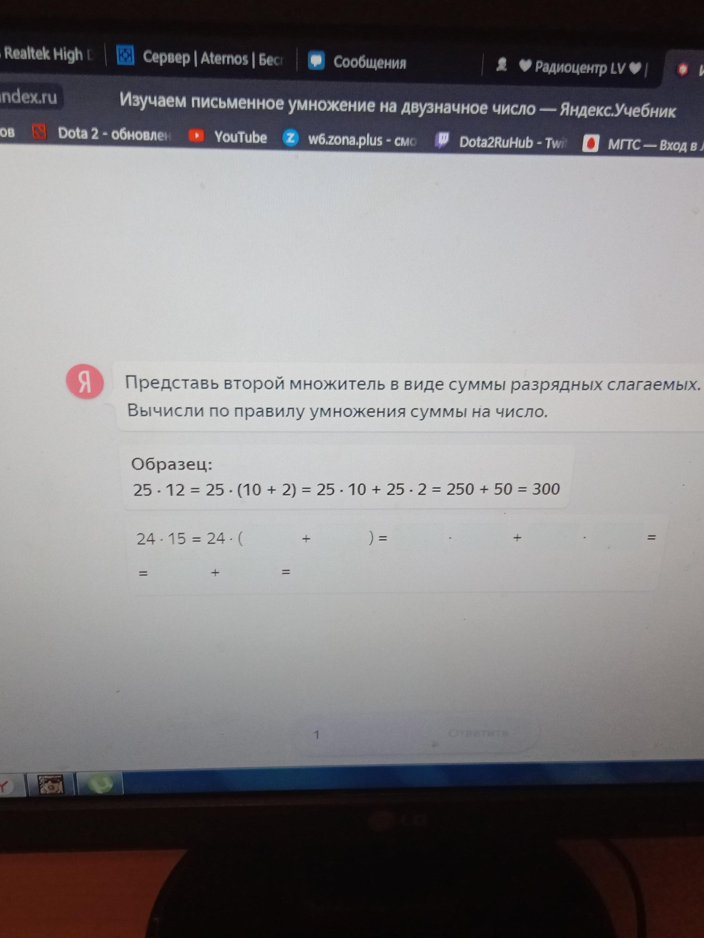 24 * 15 = 24 * (8 + 7) = 24 * 8 + 24 * 7 = 192 + 168 = 360