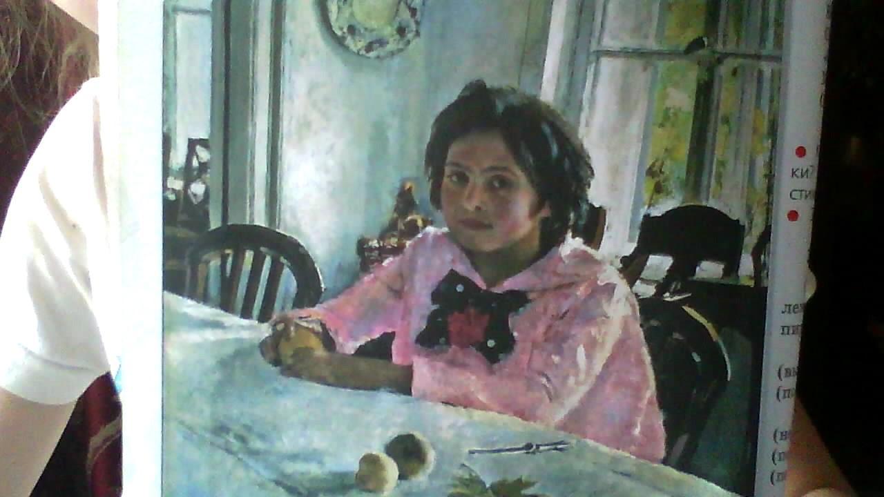 На этой картине я вижу девочку, она сидит за столом. Она загадочно смотрит на зрителя чуть улыбаясь. Она одета в розовую фуфайку с большим бантом. В руках она держит грушу. На дальнем плане мы видим просторную комнату, а в окне виден лес. Слева видна другая комната. На переднем плане видны фрукты...