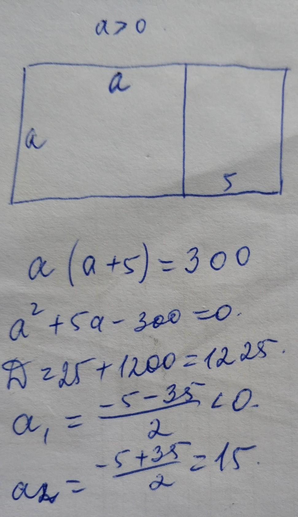 Площа прямокутного листа фанери дорівнює 300 дм2. Його розрізали на дві частини, одна з яких - квадрат, а друга - прямокутник. Знайдіть сторону квадрата, якщо сторона одержаного прямокутника , що не є стороною квадрата дорівнює 5 дм.